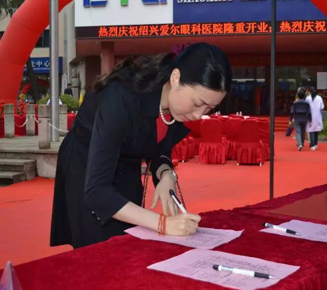 紹興市衛(wèi)計委王宏達副主任、紹興市眼科學(xué)會分會主委趙炳坤主任、浙江大學(xué)醫(yī)學(xué)院附屬邵逸夫醫(yī)院眼科主任姚玉峰教授、上海復(fù)旦大學(xué)附屬眼耳鼻喉醫(yī)院眼科主任王曉英博士、溫州醫(yī)學(xué)院附屬眼視光醫(yī)院執(zhí)行院長王勤美教授、紹興市衛(wèi)計委醫(yī)政處王健處長;紹興愛爾眼科醫(yī)院CEO祁伯軍上臺為紹興愛爾開業(yè)剪彩。